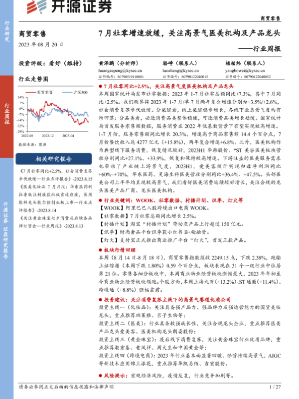 【开源证券】【20230820】7月社零增速放缓,关注高景气医美机构及产品龙头-27页
