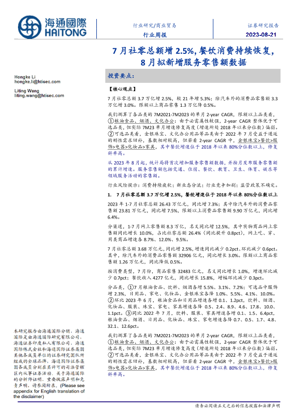 【海通国际】【20230821】7月社零总额增2.5%,餐饮消费持续恢复,8月拟新增服务零售额数据-12页