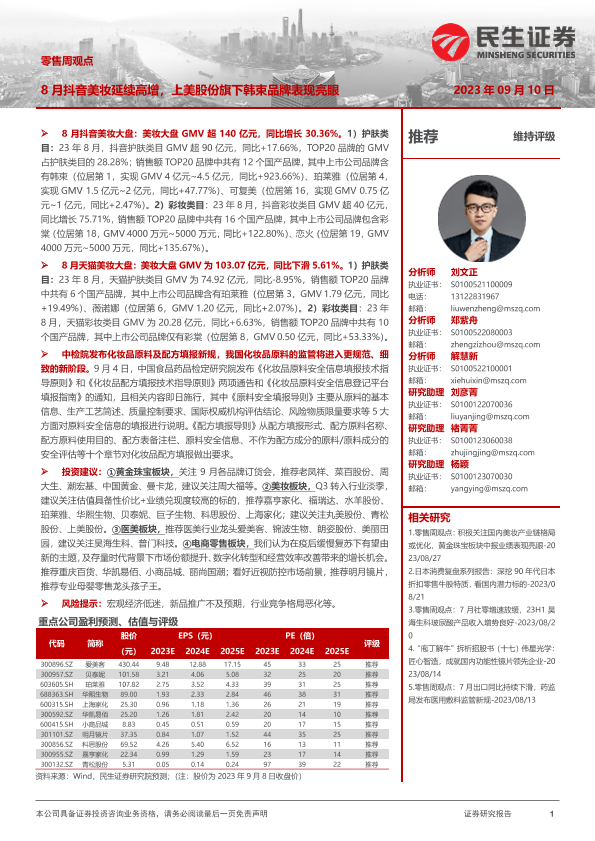 【民生证券】【20230910】8月抖音美妆延续高增,上美股份旗下韩束品牌表现亮眼-19页