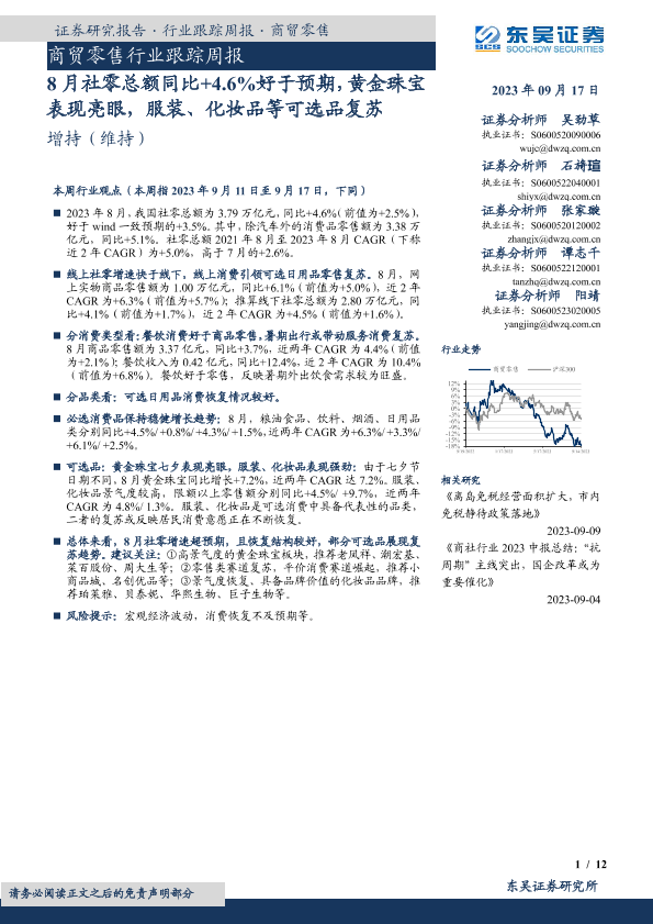 【东吴证券】【20230917】8月社零总额同比+4.6%好于预期,黄金珠宝表现亮眼,服装、化妆品等可选品复苏-12页