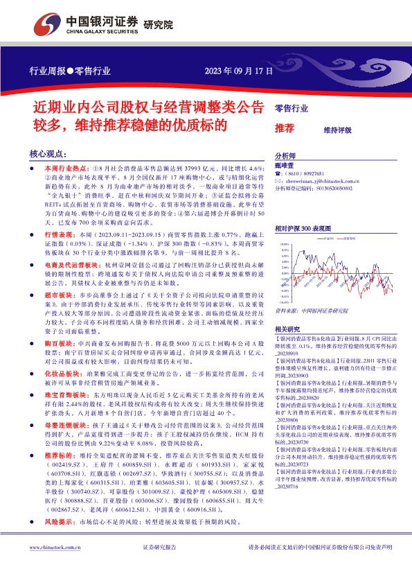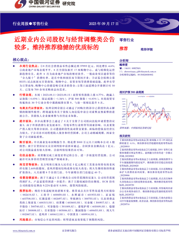 【银河证券】【20230917】零售行业周报:近期业内公司股权与经营调整类公告较多,维持推荐稳健的优质标的-15页
