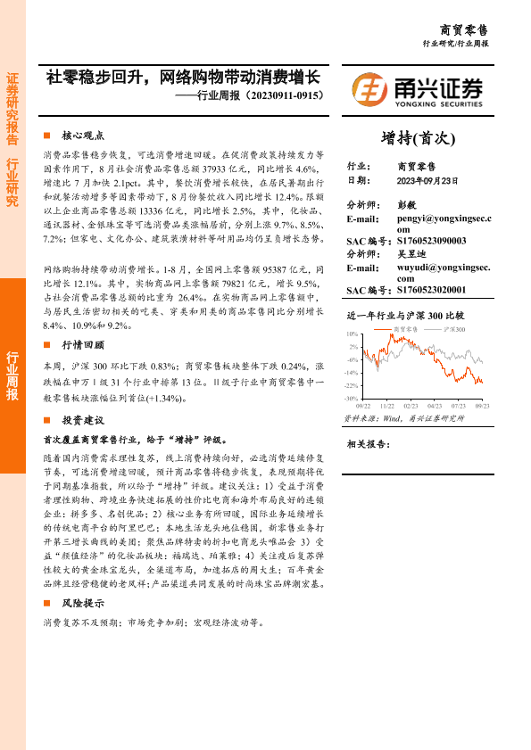 【甬兴证券】【20230923】商贸零售行业周报:社零稳步回升,网络购物带动消费增长-12页