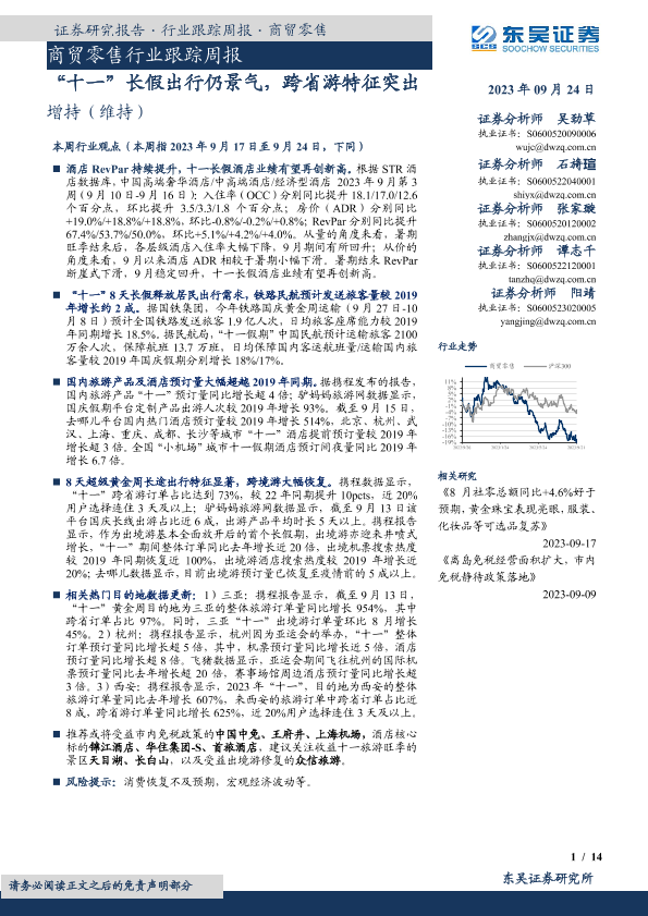 【东吴证券】【20230924】商贸零售行业跟踪周报:“十一”长假出行仍景气,跨省游特征突出-14页