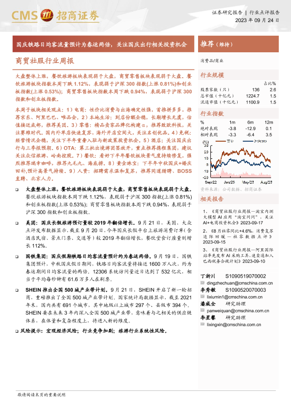 【海通证券】【20230924】商贸社服行业周报:国庆铁路日均客流量预计为春运两倍,关注国庆出行相关投资机会-10页