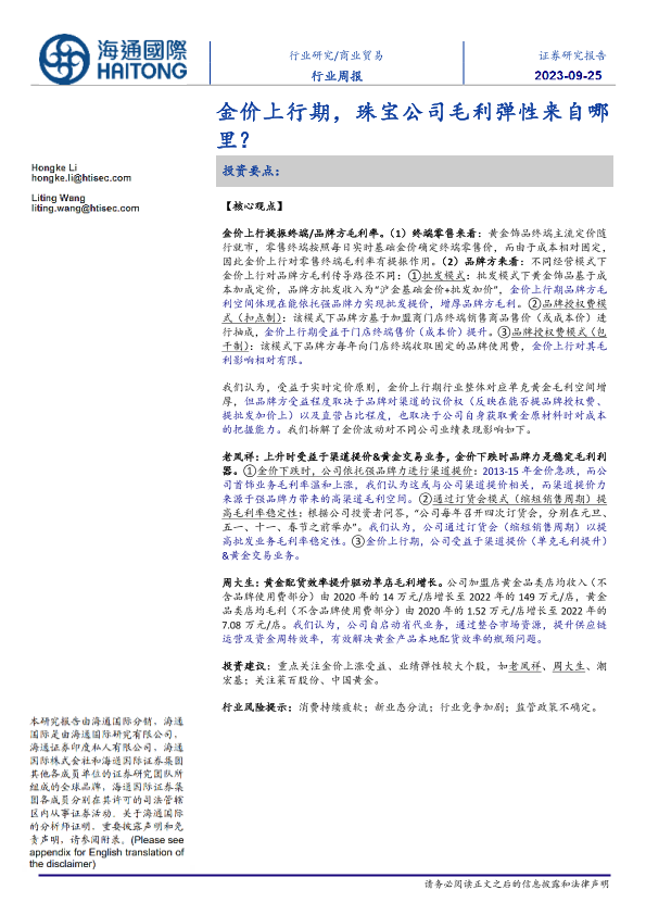 【海通国际】【20230925】金价上行期,珠宝公司毛利弹性来自哪里?-12页