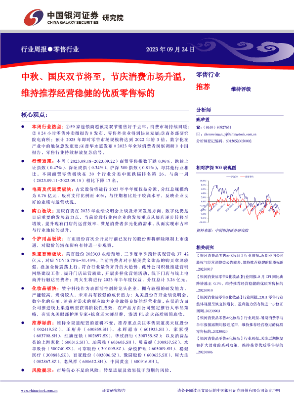 【银河证券】【20230924】零售行业周报:中秋、国庆双节将至,节庆消费市场升温,维持推荐经营稳健的优质零售标的-35页