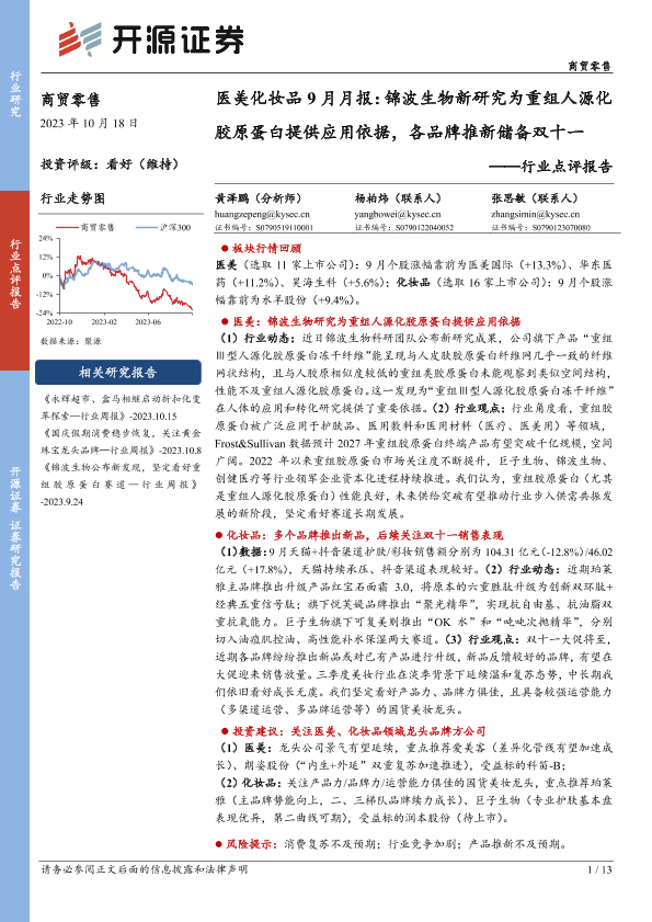 【开源证券】【20231018】医美化妆品9月月报:锦波生物新研究为重组人源化胶原蛋白提供应用依据,各品牌推新储备双十一-13页