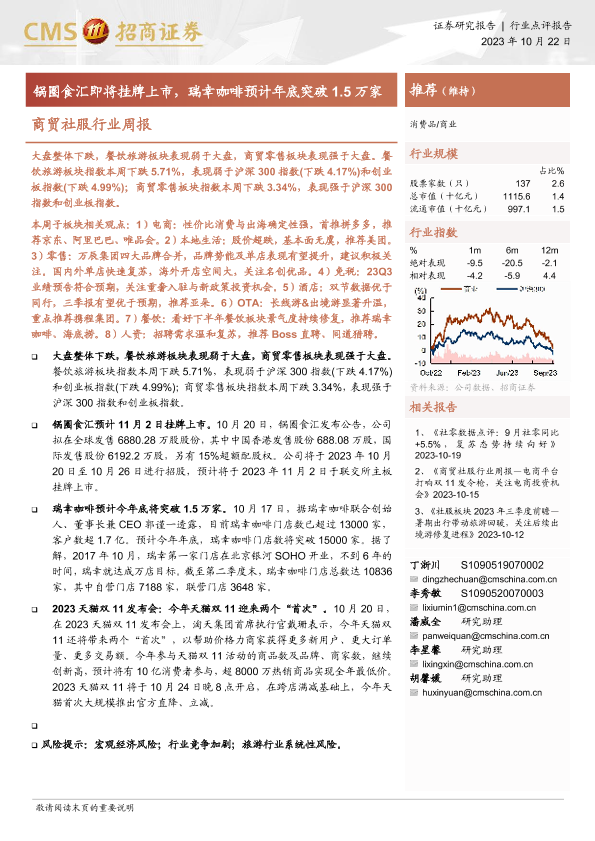 【海通证券】【20231022】商贸社服行业周报:锅圈食汇即将挂牌上市,瑞幸咖啡预计年底突破15万家-10页