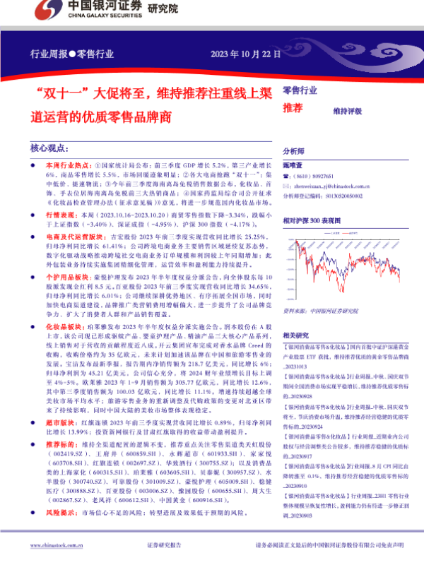 【银河证券】【20231022】零售行业周报:“双十一”大促将至,维持推荐注重线上渠道运营的优质零售品牌商-36页