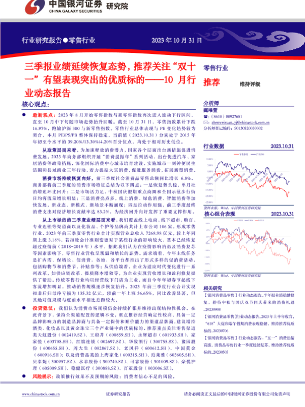 【银河证券】【20231031】零售10月行业动态报告:三季报业绩延续恢复态势,推荐关注“双十一”有望表现突出的优质标的-22页