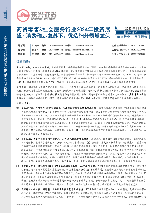 【东兴证券】【20231130】2024年商贸零售&社会服务行业投资展望:消费稳步复苏下,优选细分领域龙头-22页