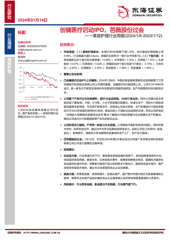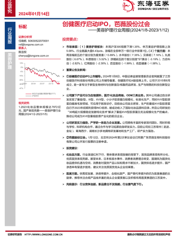 【东海证券】【20240114】美容护理行业周报:创健医疗启动IPO,芭薇股份过会-10页