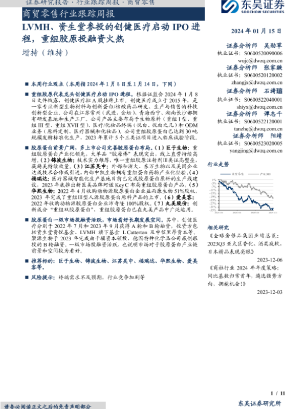 【东吴证券】【20240115】商贸零售行业跟踪周报:LVMH、资生堂参投的创健医疗启动IPO进程,重组胶原投融资火热-11页