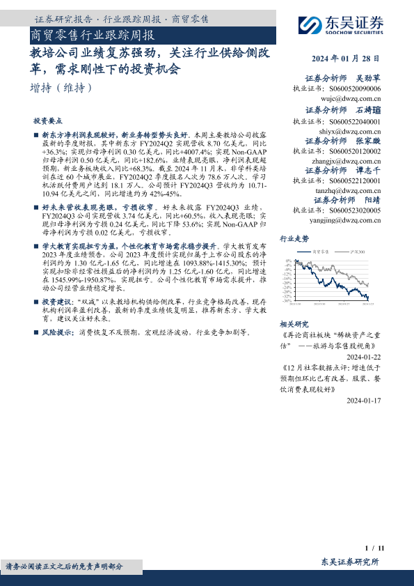 【东吴证券】【20240128】商贸零售行业跟踪周报:教培公司业绩复苏强劲,关注行业供给侧改革,需求刚性下的投资机会-11页