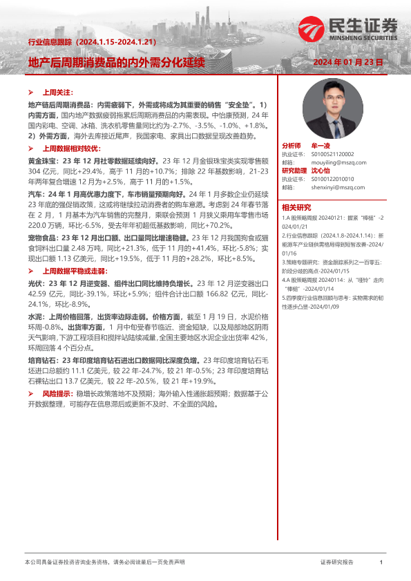 【民生证券】【20240123】地产后周期消费品的内外需分化延续-26页