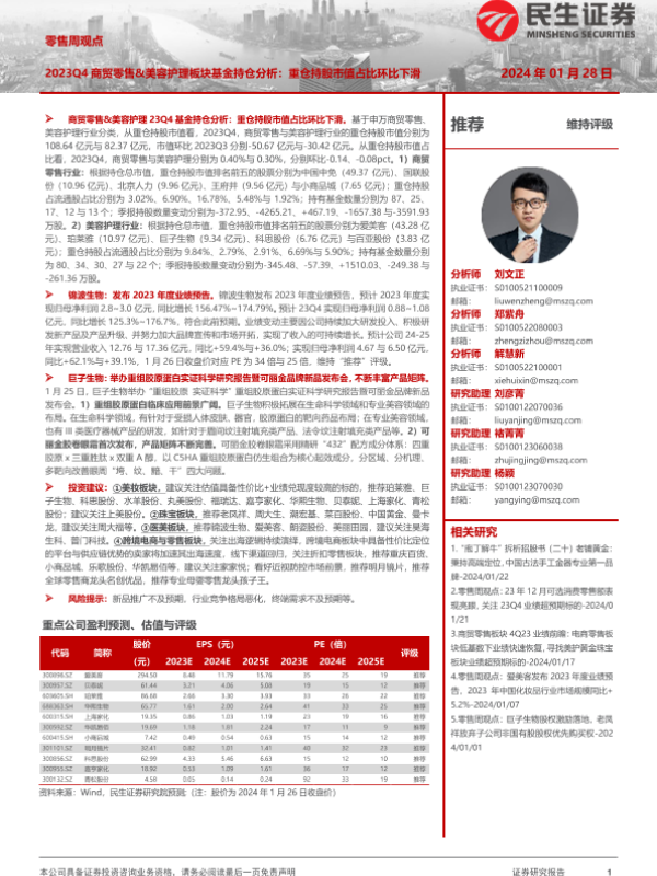 【民生证券】【20240128】2023Q4商贸零售&美容护理板块基金持仓分析:重仓持股市值占比环比下滑-20页