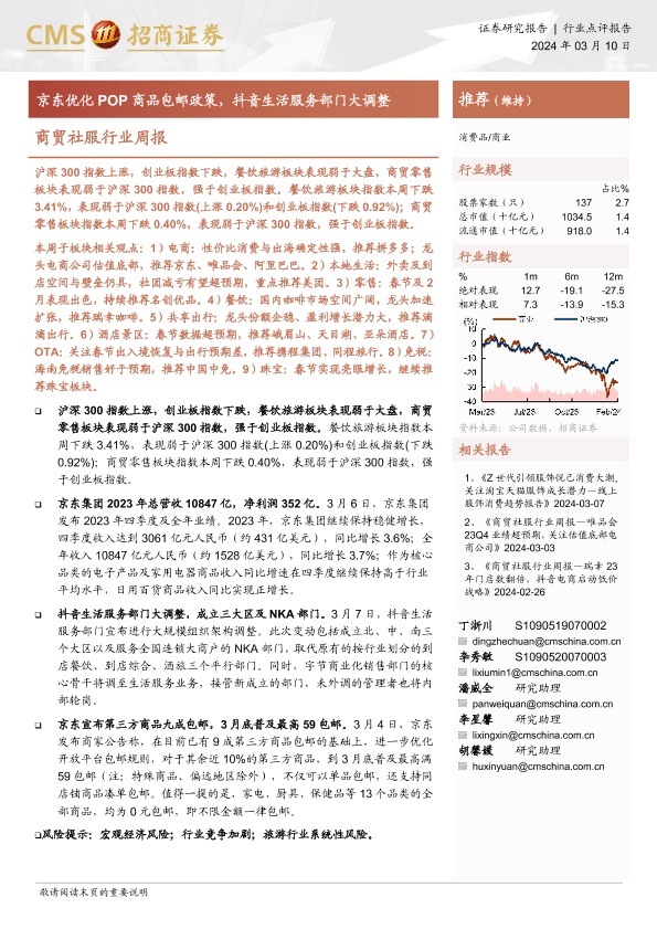 【海通证券】【20240310】商贸社服行业周报:京东优化POP商品包邮政策,抖音生活服务部门大调整-11页