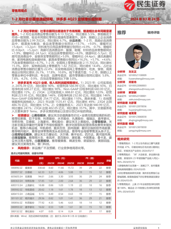 【民生证券】【20240324】零售周观点:1-2月社零总额增速超预期,拼多多4Q23业绩增长超预期-17页