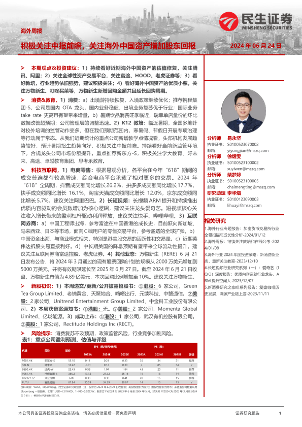 【民生证券】【20240624】海外周报:积极关注中报前瞻,关注海外中国资产增加股东回报-19页
