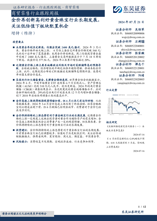 【东吴证券】【20240721】商贸零售行业跟踪周报:金价再创新高利好黄金珠宝行业长期发展-12页
