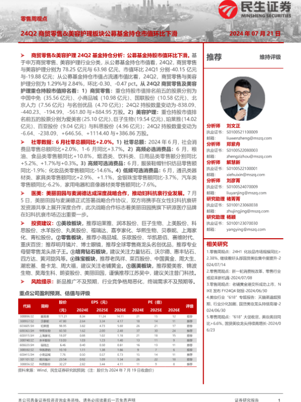 【民生证券】【20240721】零售周观点:24Q2商贸零售&美容护理板块公募基金持仓市值环比下滑-19页