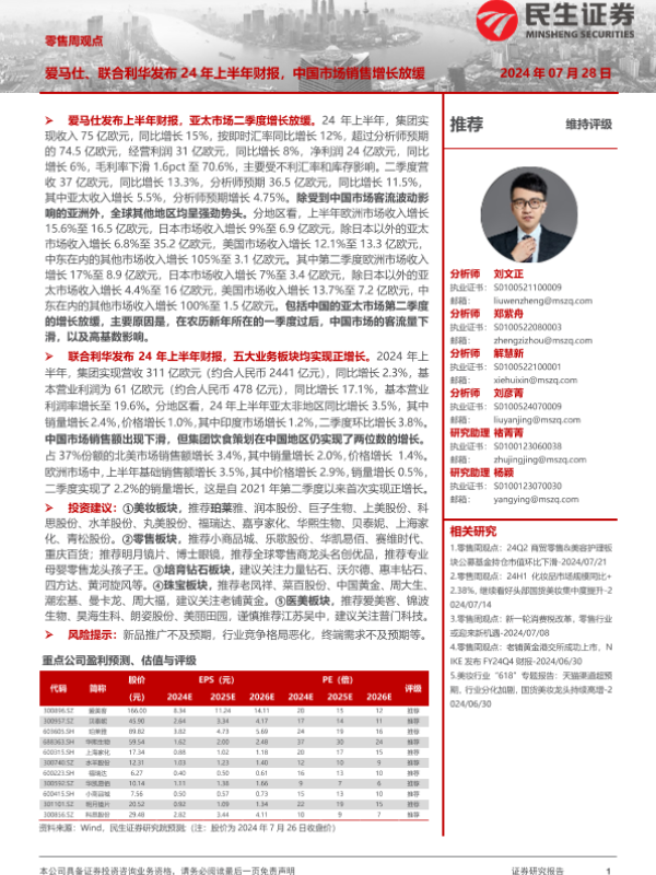 【民生证券】【20240728】零售周观点:爱马仕、联合利华发布24年上半年财报,中国市场销售增长放缓-16页