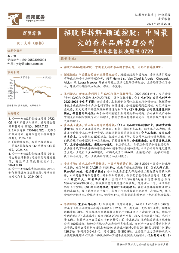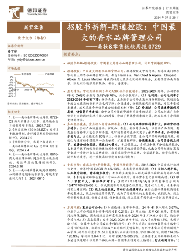 【德邦证券】【20240729】美妆&零售板块周报:招股书拆解-颖通控股-16页