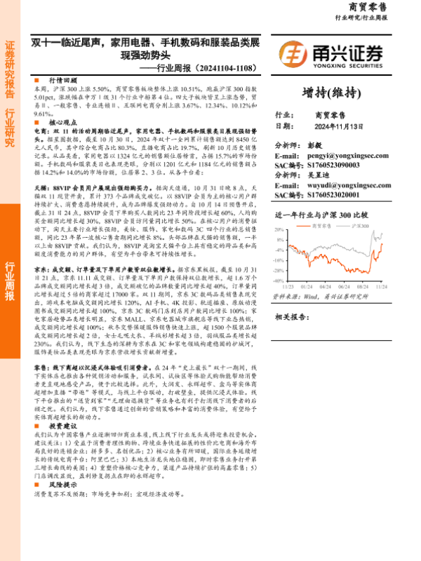 【甬兴证券】【20241113】商贸零售行业周报:双十一临近尾声,家用电器、手机数码和服装品类展现强劲势头-13页