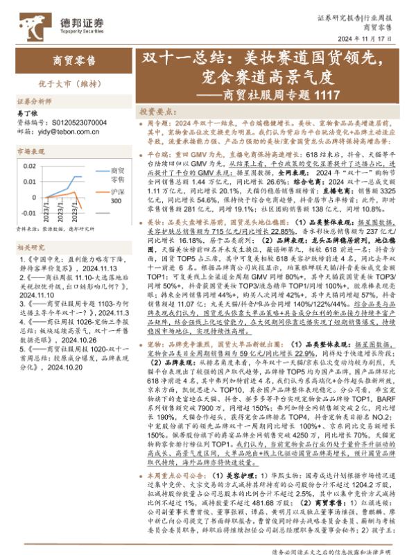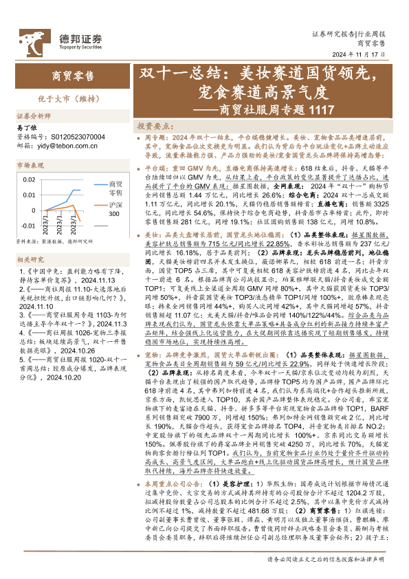 【德邦证券】【20241117】商贸社服行业周专题双十一总结:美妆赛道国货领先,宠食赛道高景气度-10页