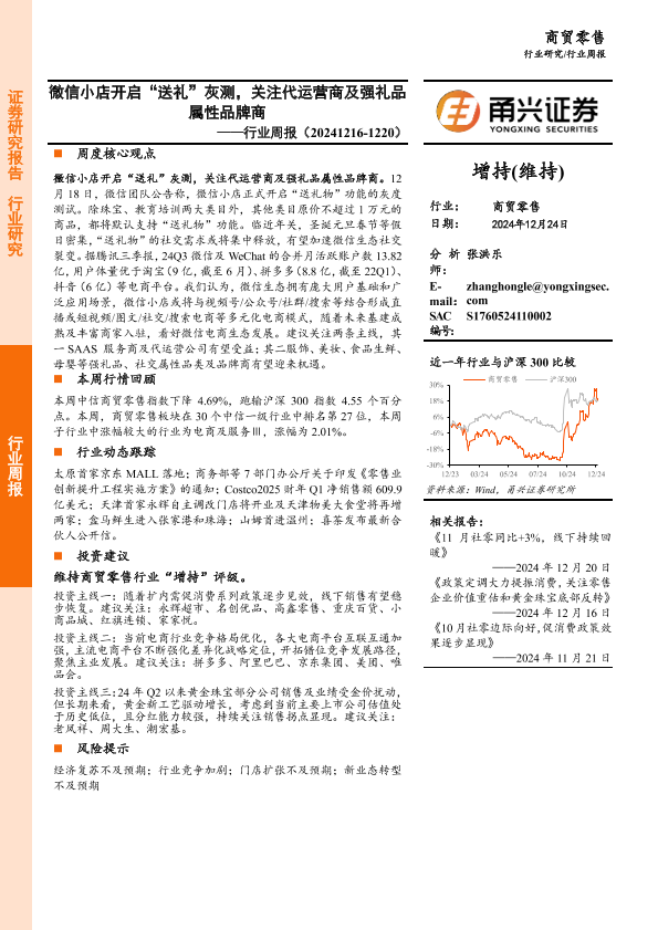 【甬兴证券】【20241224】商贸零售行业周报:微信小店开启“送礼”灰测,关注代运营商及强礼品属性品牌商-13页