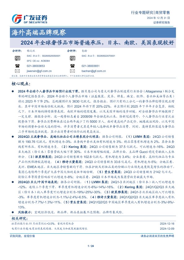 【广发证券】【20241231】2024年全球奢侈品市场普遍承压,日本、南欧、美国表现较好-24页