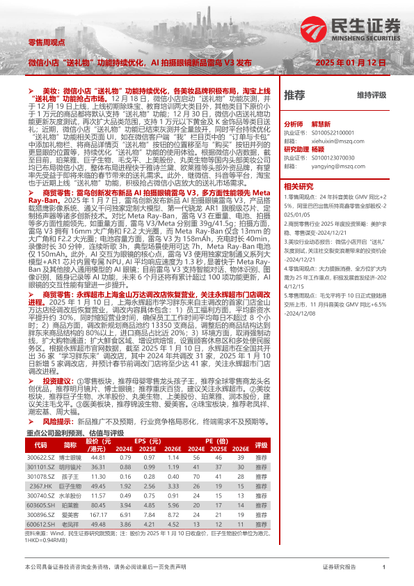 【民生证券】【20250112】零售周观点:微信小店“送礼物”功能持续优化,AI拍摄眼镜新品雷鸟V3发布-21页