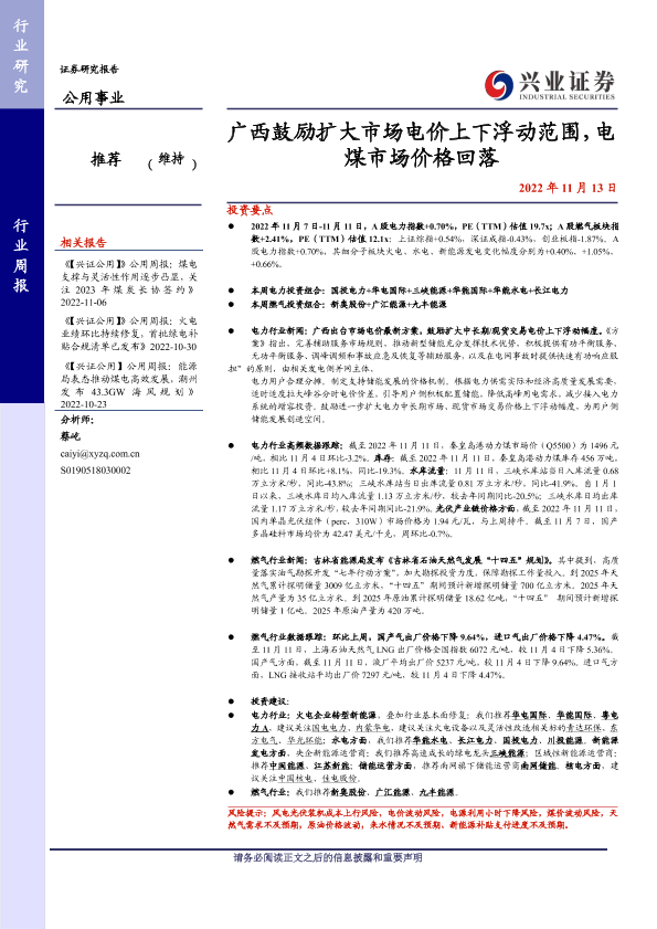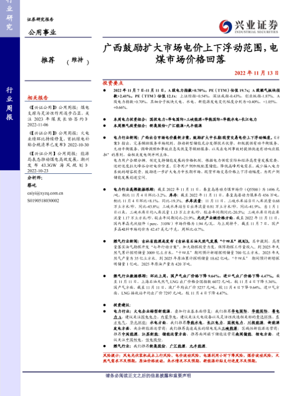 【兴业证券】【20221113】公用事业行业周报:广西鼓励扩大市场电价上下浮动范围,电煤市场价格回落-21页