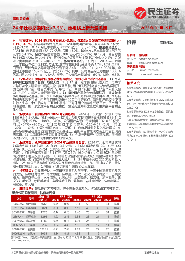 【民生证券】【20250119】零售周观点:24年社零总额同比+3.5%,重视线上新渠道机遇-19页