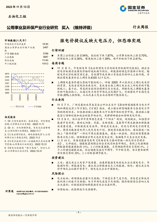 【国金证券】【20221113】公用事业及环保产业行业研究:涨电价提议反映火电压力,但恐难实现-16页