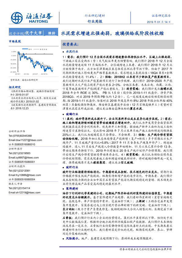 【海通证券】【20190114】建材行业周报:水泥需求增速北强南弱,玻璃供给或阶段性收缩-19页
