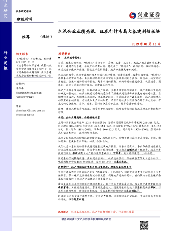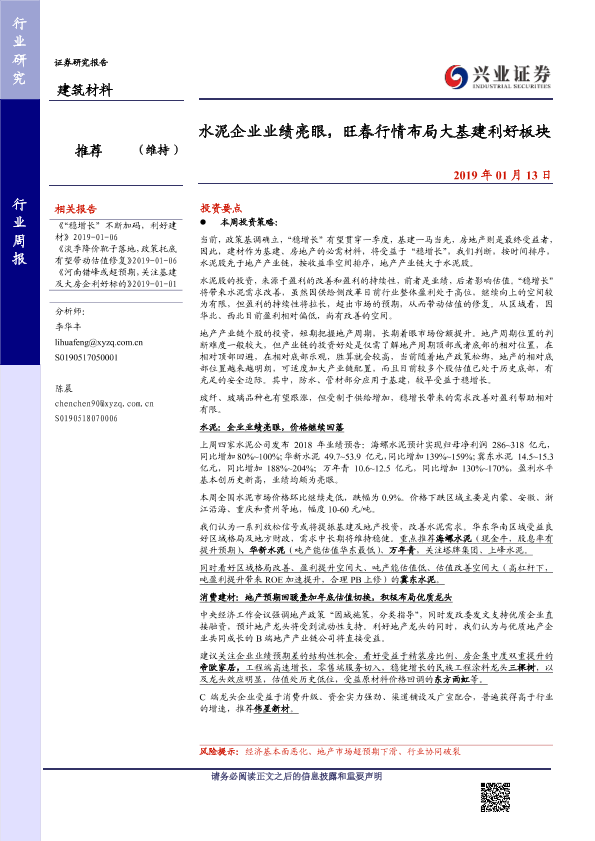 【兴业证券】【20190113】水泥企业业绩亮眼,旺春行情布局大基建利好板块-16页
