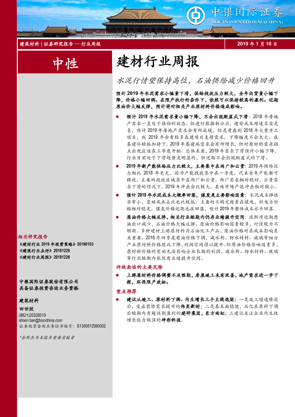 【中银证券】【20190116】建材行业周报:水泥行情望保持高位,石油供给减少价格回升-14页