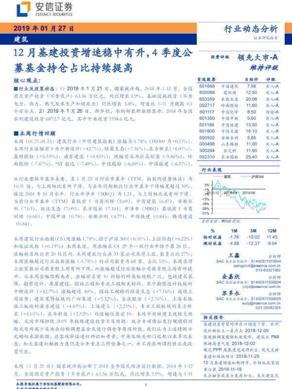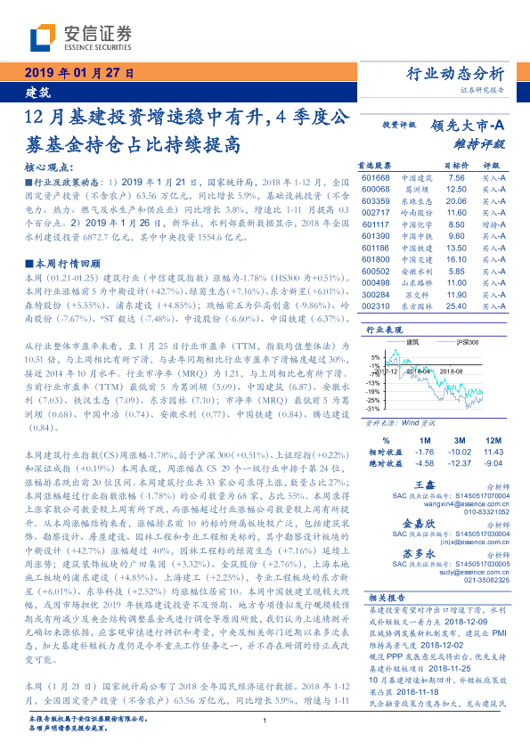 【安信证券】【20190127】建筑行业动态分析:12月基建投资增速稳中有升,4季度公募基金持仓占比持续提高-11页