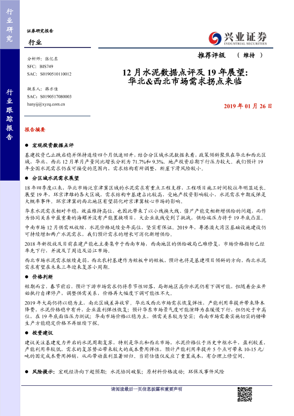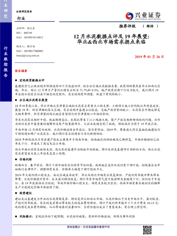 【兴业证券】【20190126】12月水泥数据点评及19年展望:华北&西北市场需求拐点来临-8页