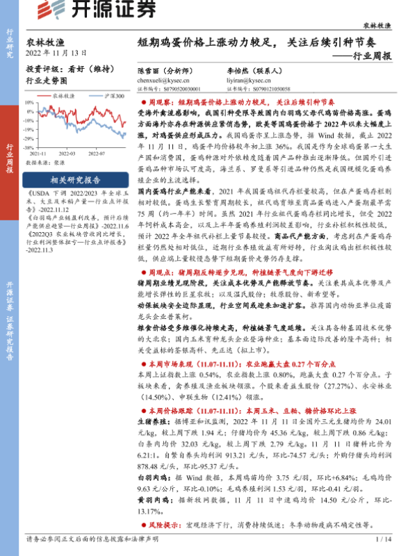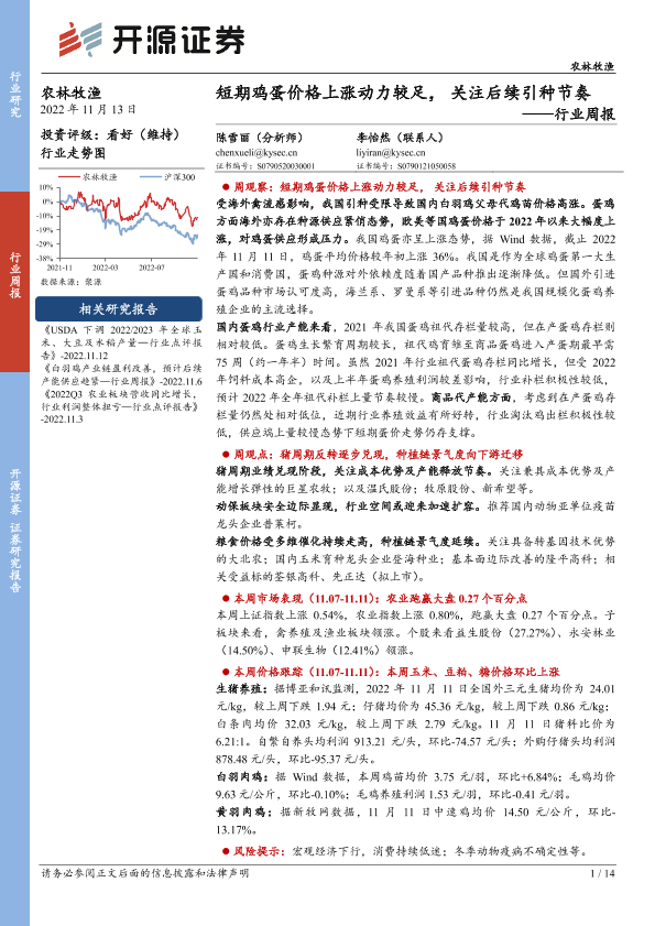 【开源证券】【20221113】农林牧渔行业周报:短期鸡蛋价格上涨动力较足,关注后续引种节奏-14页