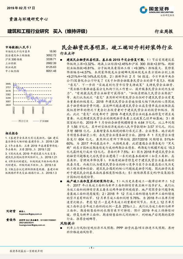 【国金证券】【20190217】建筑和工程行业研究周报:民企融资改善明显,竣工端回升利好装饰行业-11页