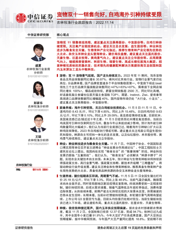 【中信证券】【20221114】农林牧渔行业跟踪报告:宠物双十一销售向好,白鸡海外引种持续受限-20页