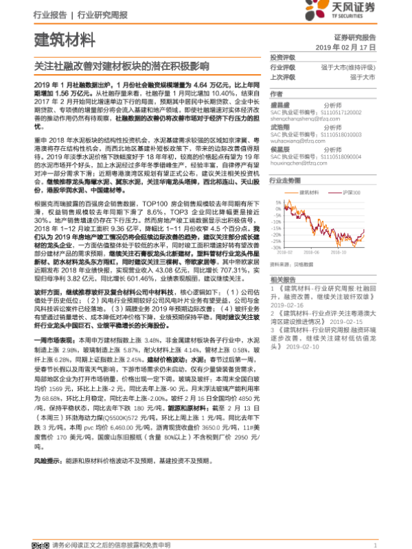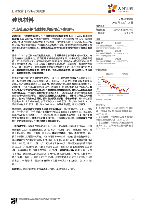 【天风证券】【20190217】建筑材料行业研究周报:关注社融改善对建材板块的潜在积极影响-11页