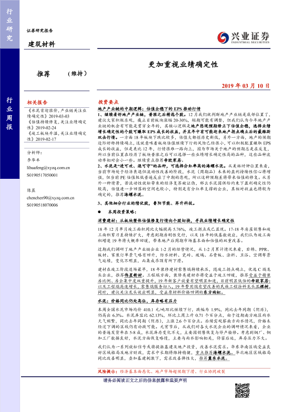 【兴业证券】【20190310】建筑材料行业周报:更加重视业绩确定性-17页