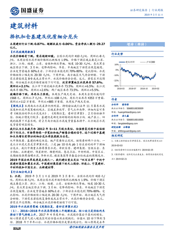 【国盛证券】【20190311】建筑材料行业周报:择机加仓基建及优质细分龙头-23页