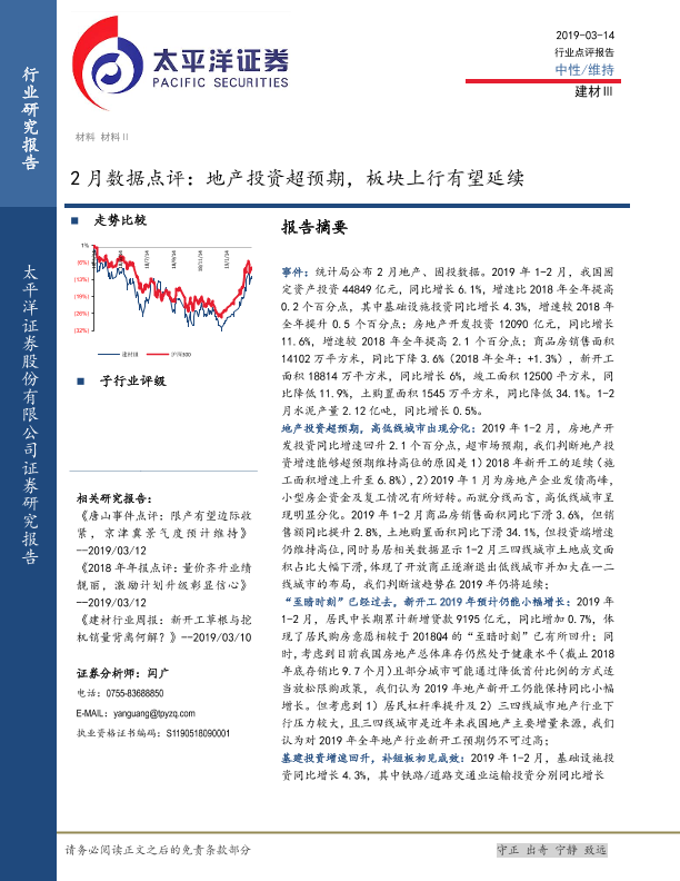 【太平洋证券】【20190314】建材Ⅲ2月数据点评:地产投资超预期,板块上行有望延续-8页