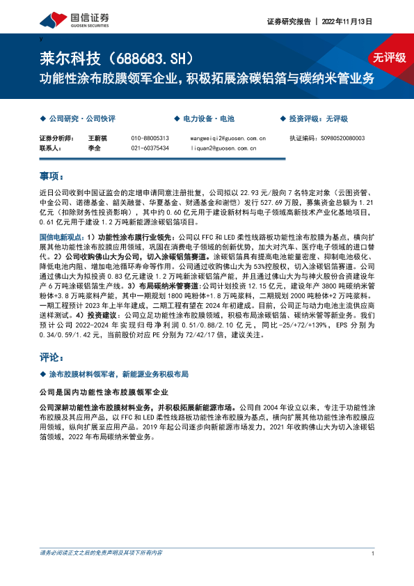 【国信证券】【20221113】功能性涂布胶膜领军企业,积极拓展涂碳铝箔与碳纳米管业务-22页