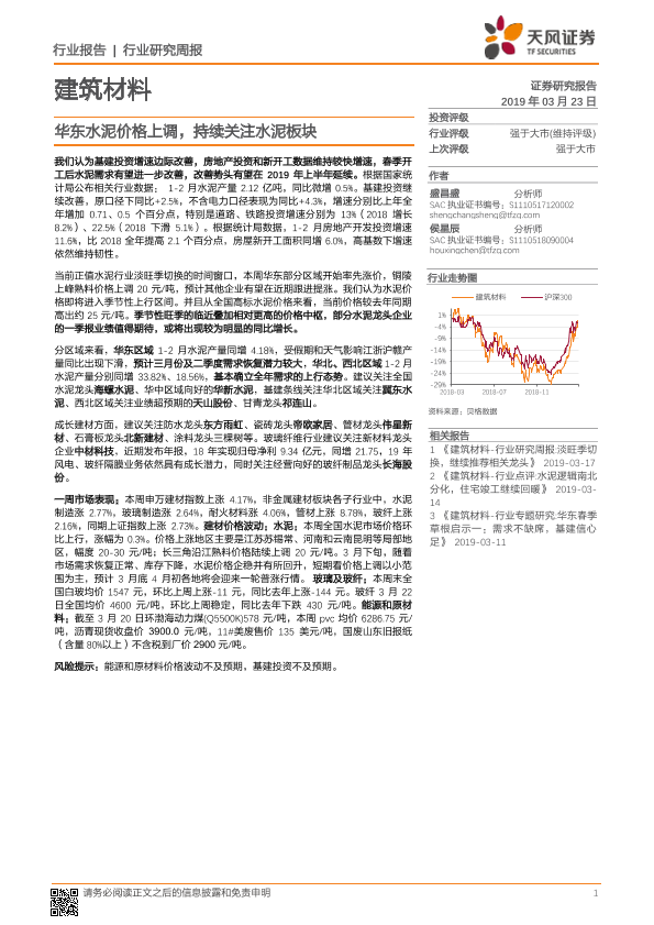 【天风证券】【20190323】建筑材料行业研究周报:华东水泥价格上调,持续关注水泥板块-12页