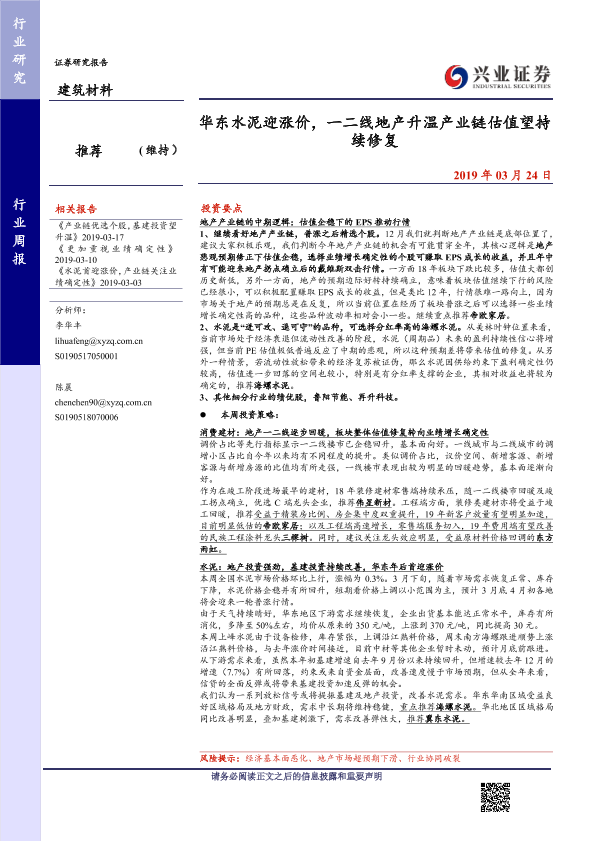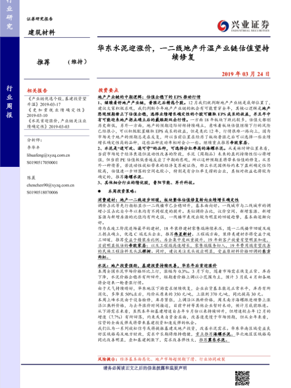 【兴业证券】【20190324】华东水泥迎涨价,一二线地产升温产业链估值望持续修复-17页